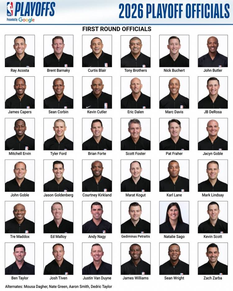 NBA季后赛首轮裁判大名单:福斯特领衔 1名女裁判入选